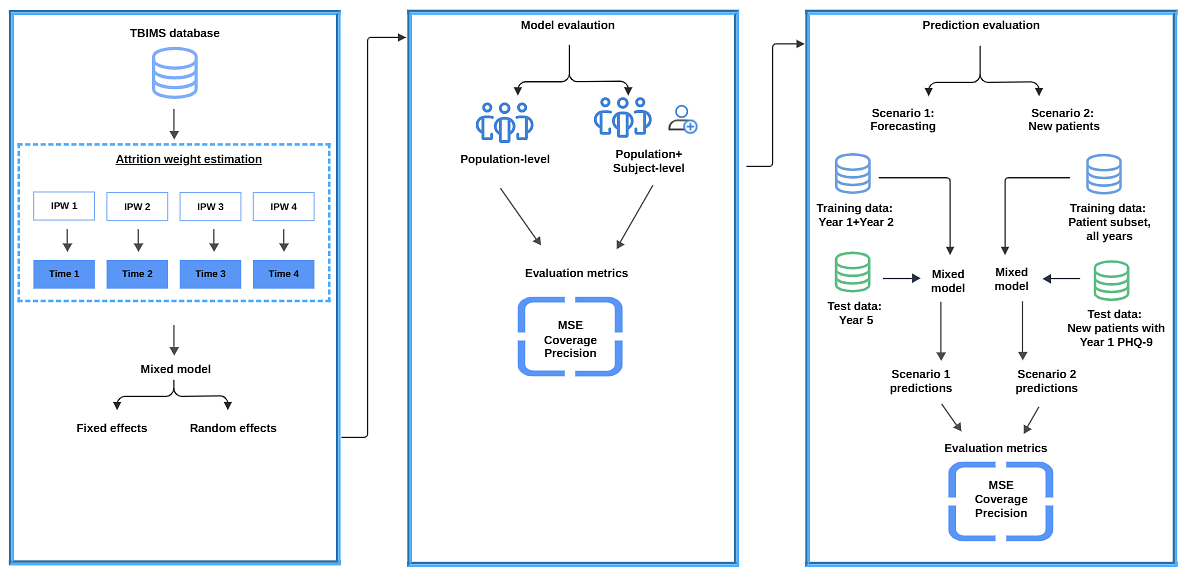 The sample comprised 19,397 individuals (mean age 43). Depression scores showed a small decrease over time among those with pre-injury mental health treatment history, but this change was not clinical meaningful. Significant predictors of Year 1 depression included pre-injury mental health treatment (β=1.6), female sex (β=0.86), and prior head injuries (β=0.4). When predicting depression for existing patients using early depression scores, the model achieved precision of 3.7 points, whereas for new patients, the model's precision was 6 points. Conditional predictions outperformed marginal predictions.